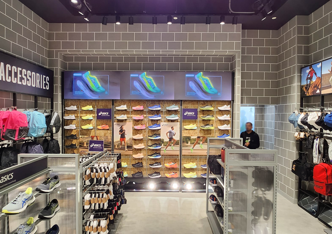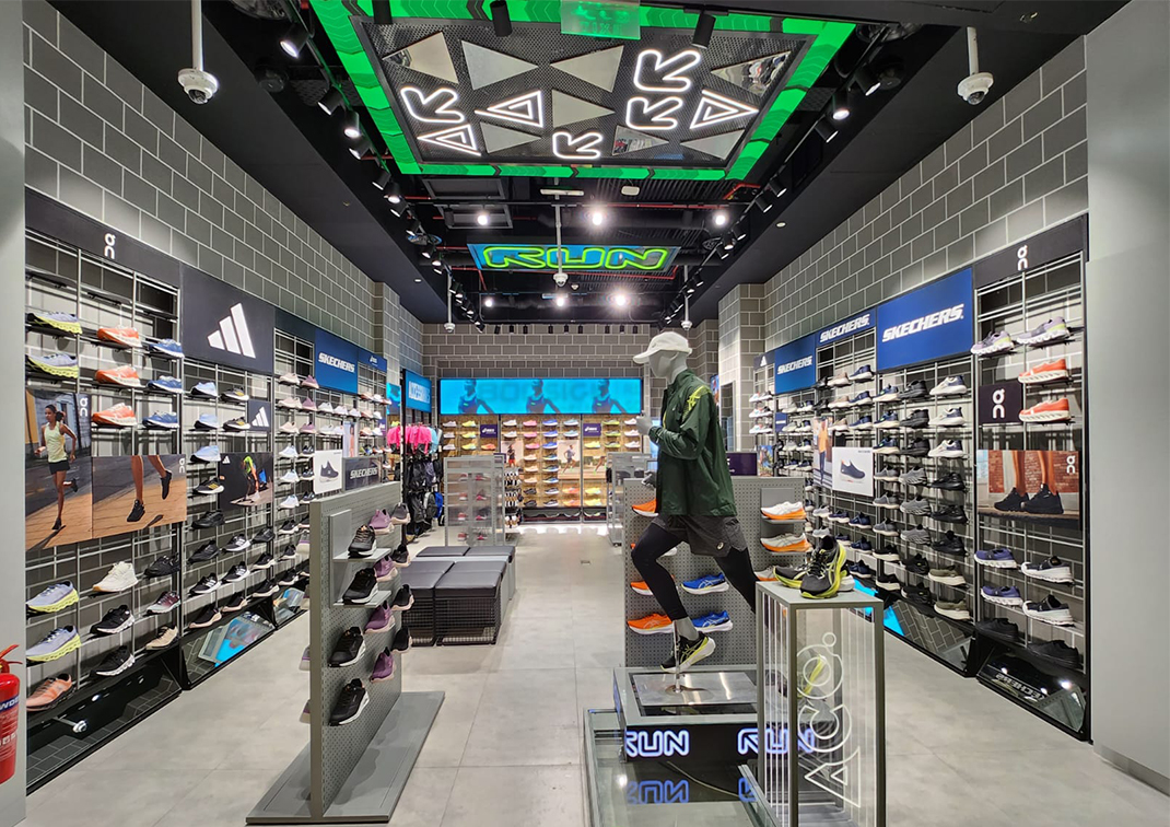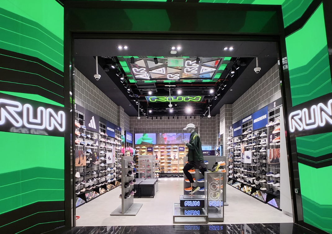 ACO store at Riyad Park, KSA, a leading multi-brand sports lifestyle concept. The space showcases iconic footwear brands enhanced by dynamic LED displays, using pixel pitch P2.5 indoor screen with a refresh rate of 3840 Hz.